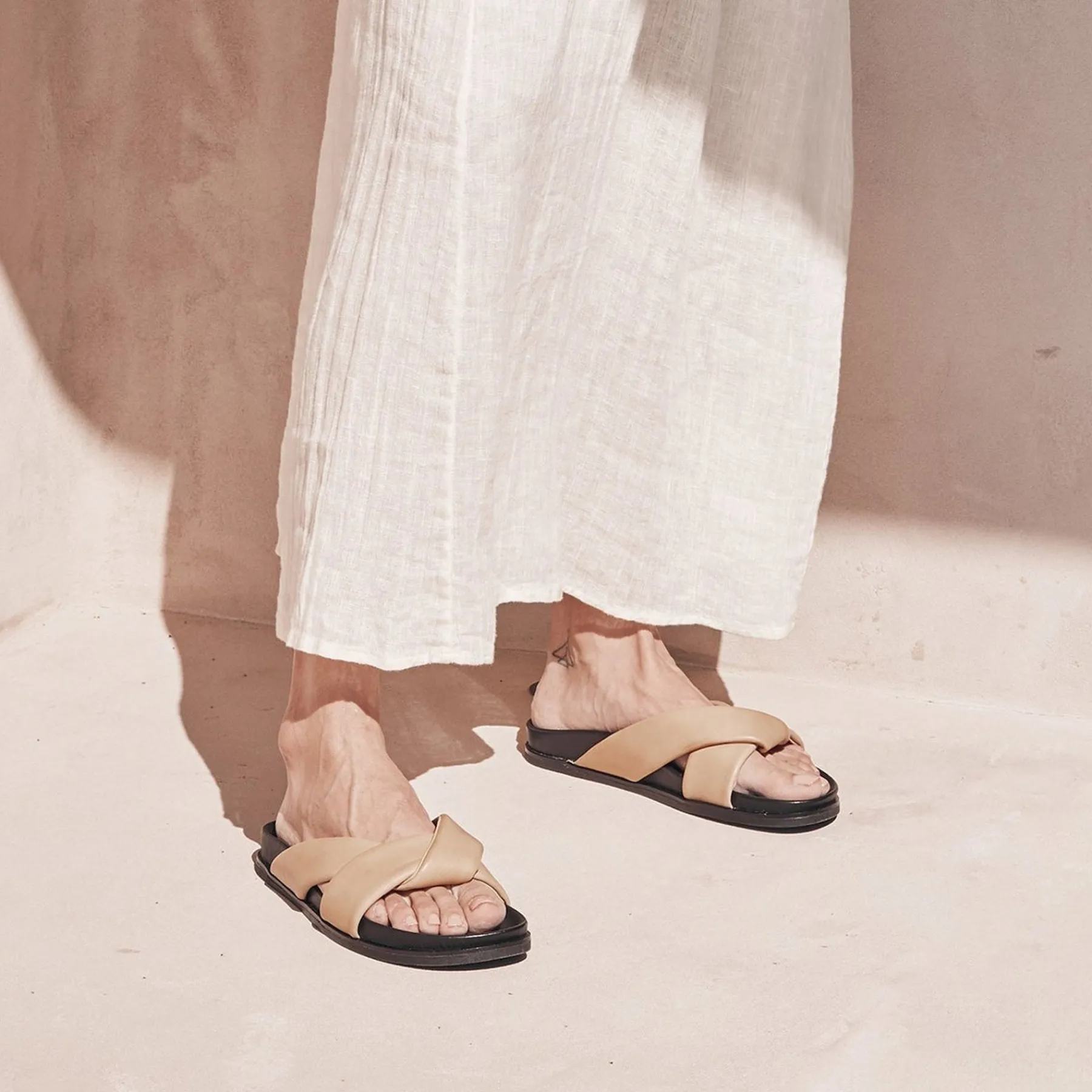 Every bit as comfortable as they look, these cross sandals offer all the padding of a pair of slippers, with the cool simplicity of a pair of slides. Slip them on and let the plush leather straps caress your feet, with a contoured footbed to mirror the curves underneath. One of our hero styles for the summer, Cross is the ultimate warm weather companion, offering everything you need for fuss-free summer styling.