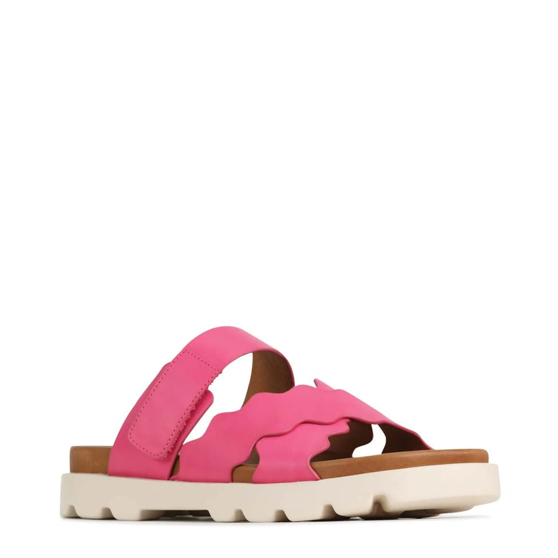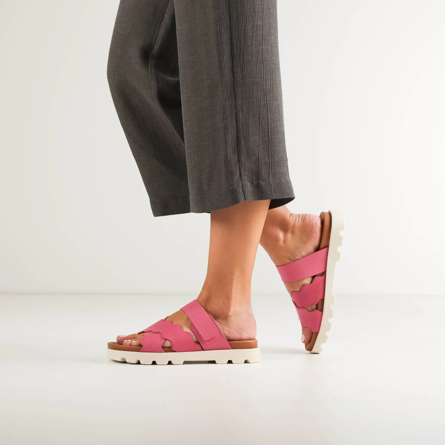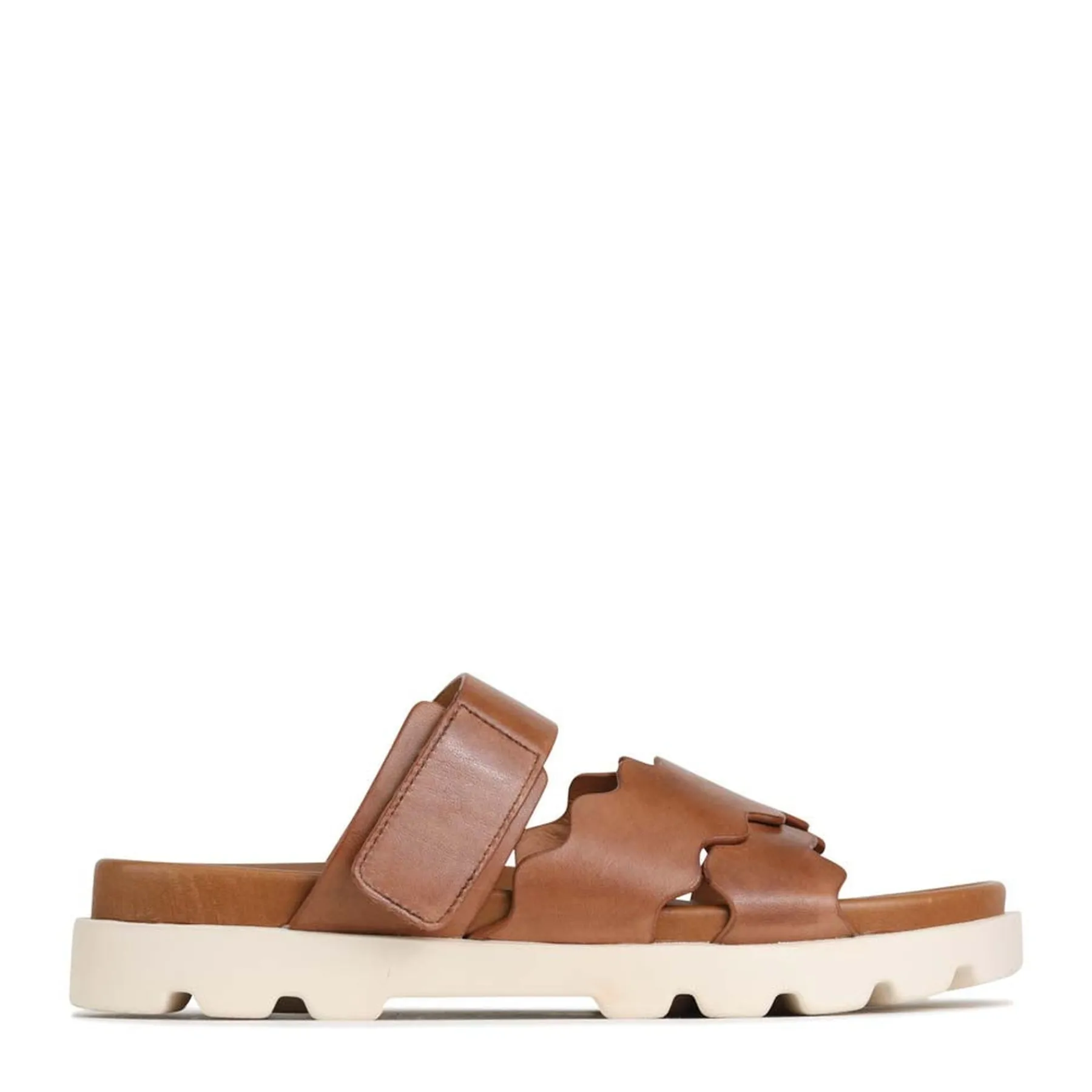 Introducing NISSA, a luxurious flat slide crafted from Cashmere or Blanco leather, featuring an adjustable velcro upper strap and a square toe with intricate scallop edged cross over straps. This exquisite design ensures unparalleled comfort and an unforgettable experience that will have you feeling like you are walking on clouds.