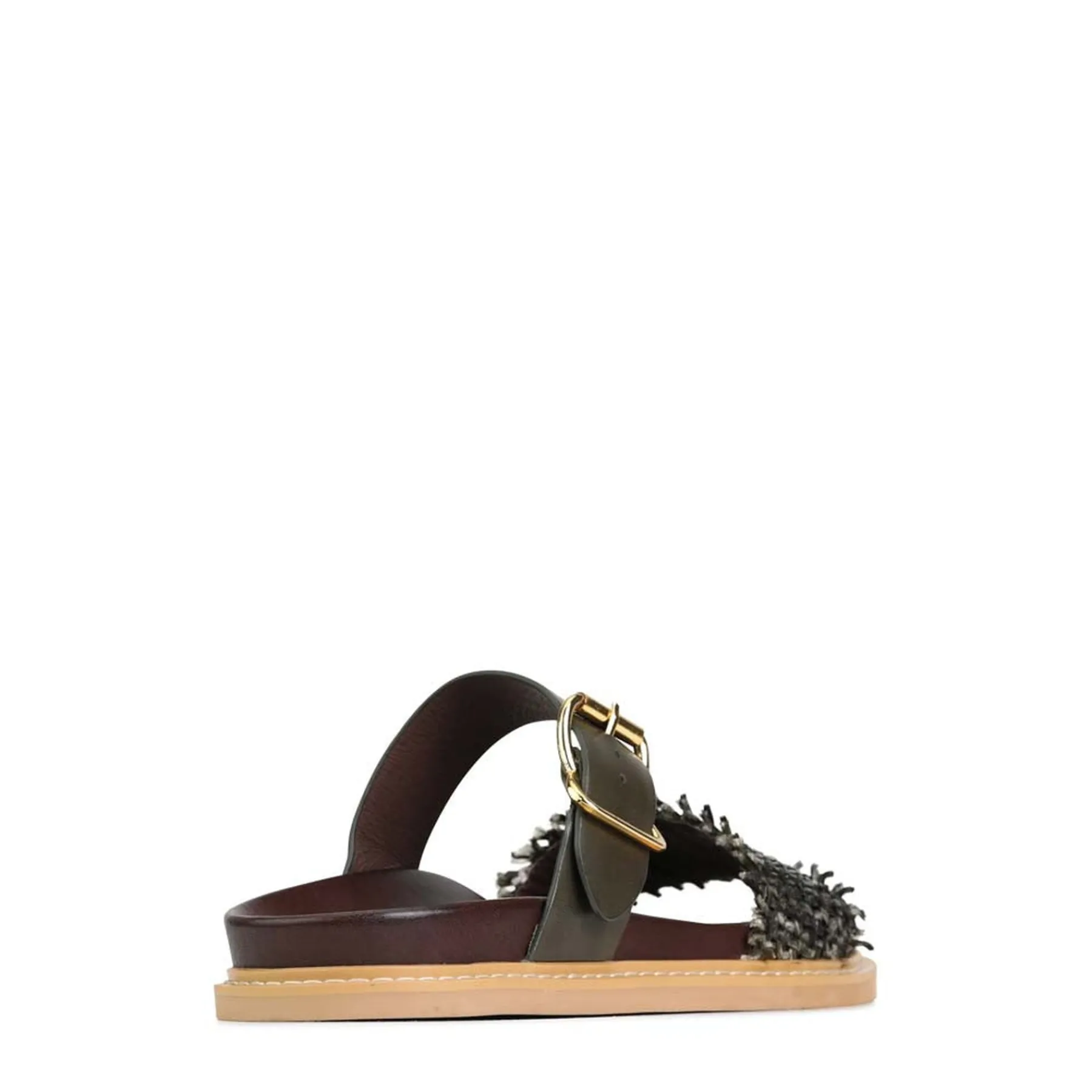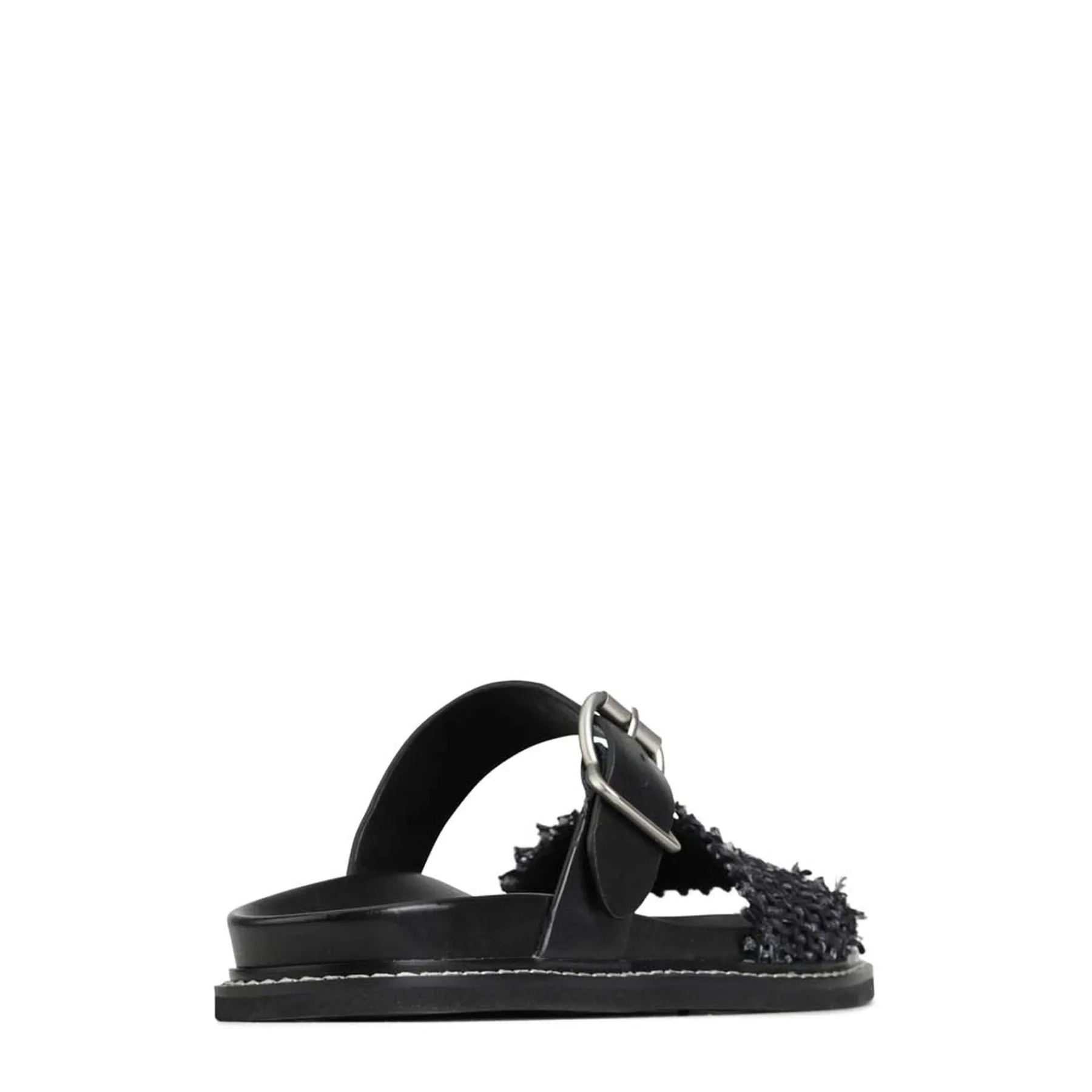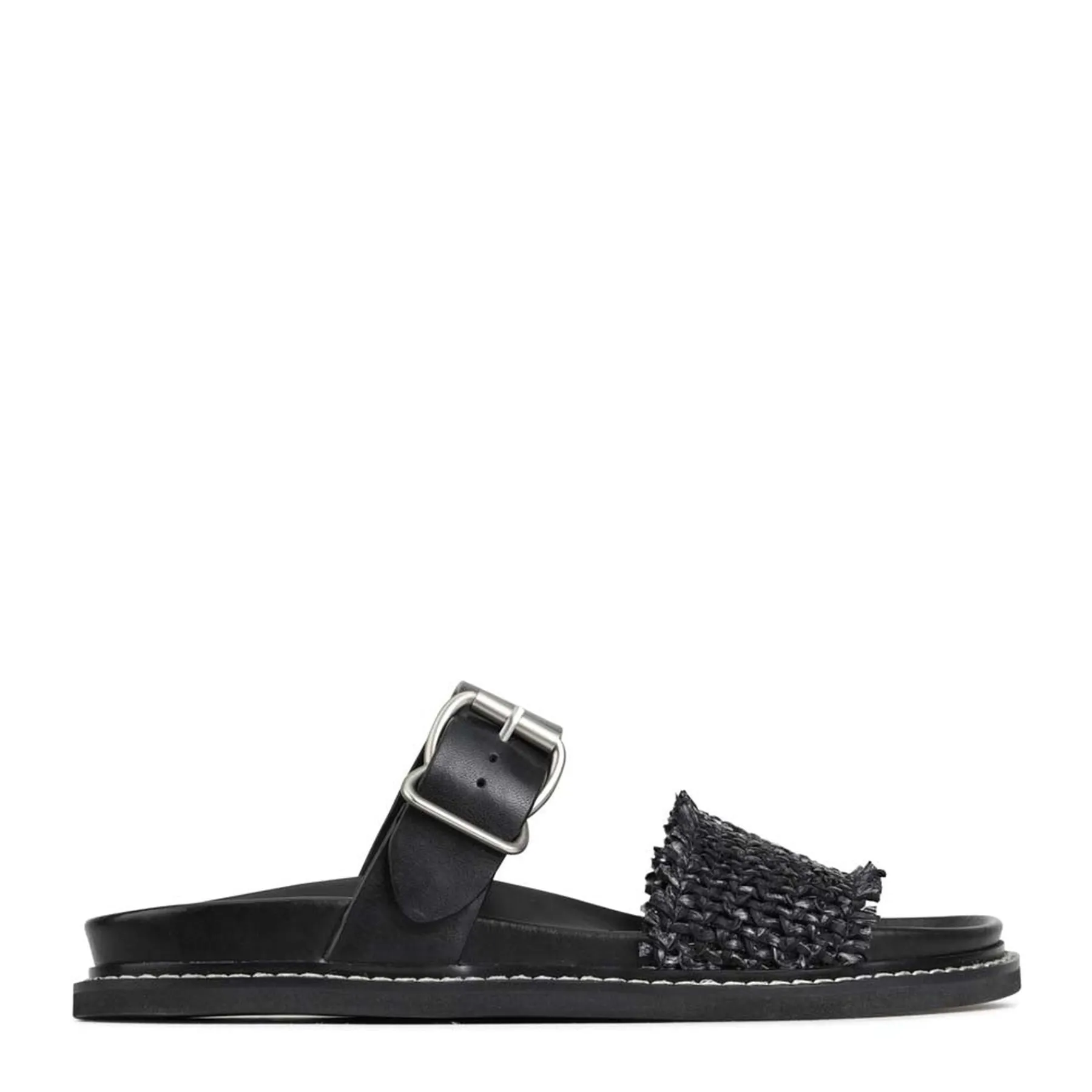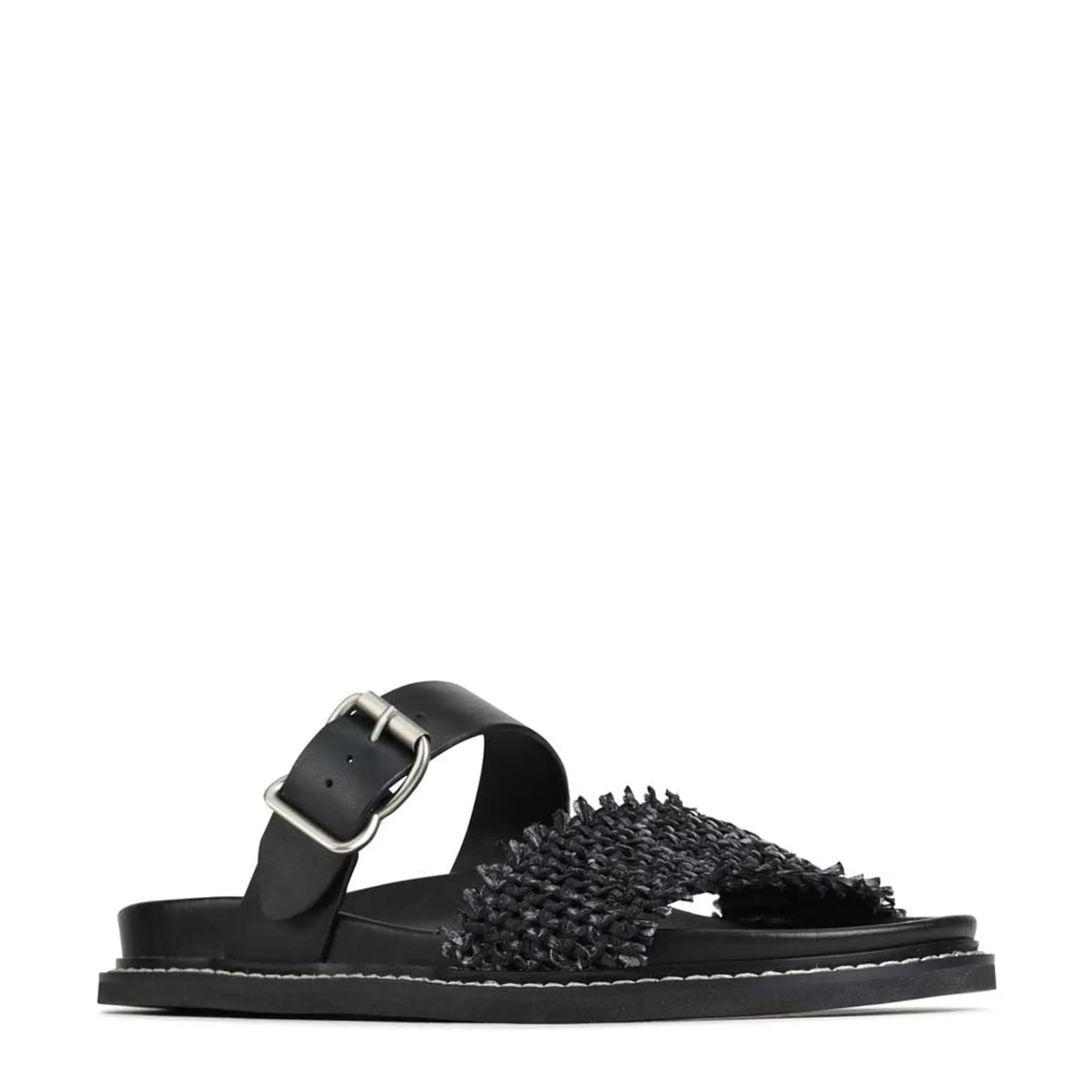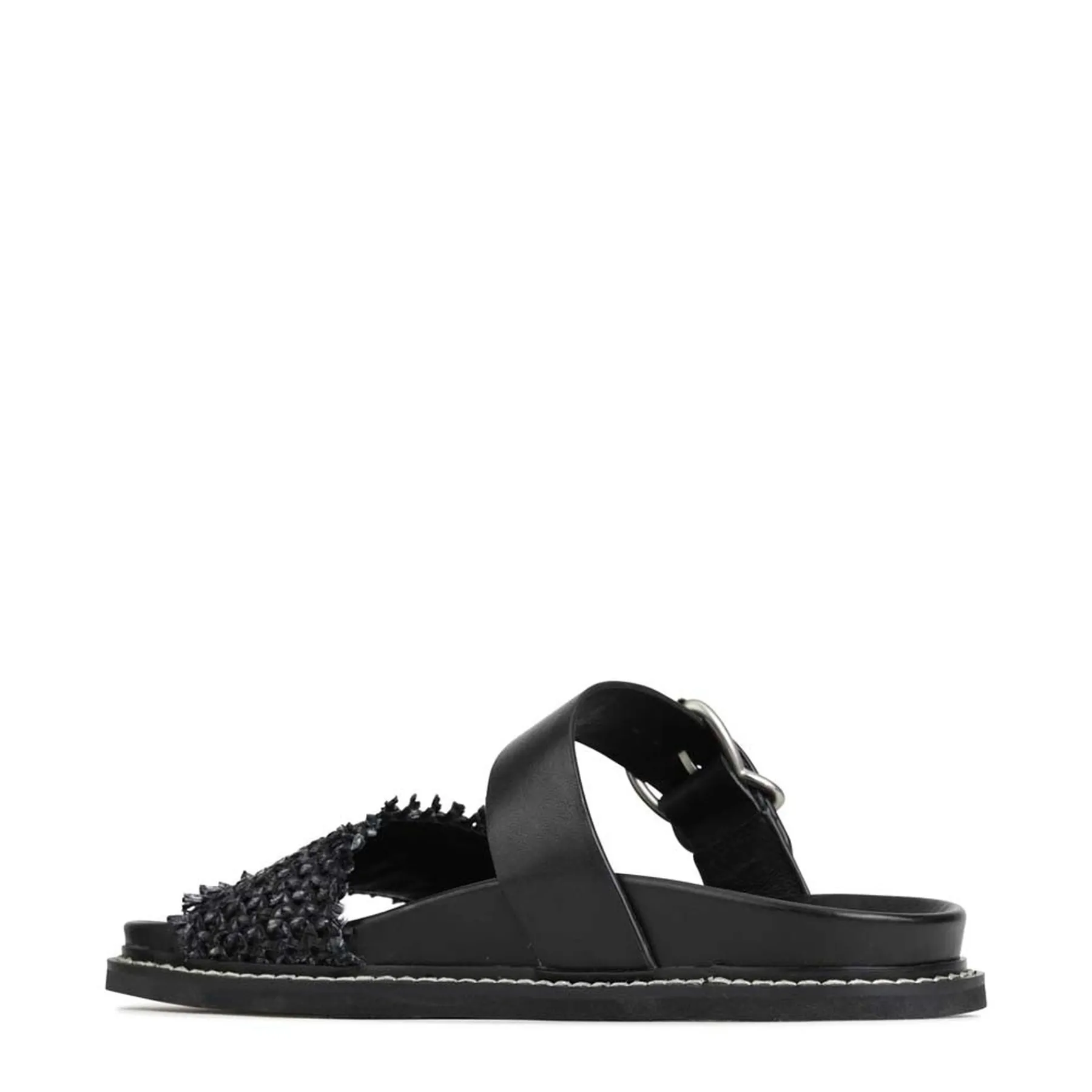 Introducing WEAVE, a sophisticated pair of slides crafted with luxurious cashmere leather and premium manmade materials, evoking a feeling of luxury at your every step. These elegant sandals feature a leather wrapped footbed, heavy top stitched rand, adjustable buckle strap, and a woven leather foot strap with a 5mm thick full rubber outsole, offering a chic look with superior stability. Indulge in luxury with WEAVE.