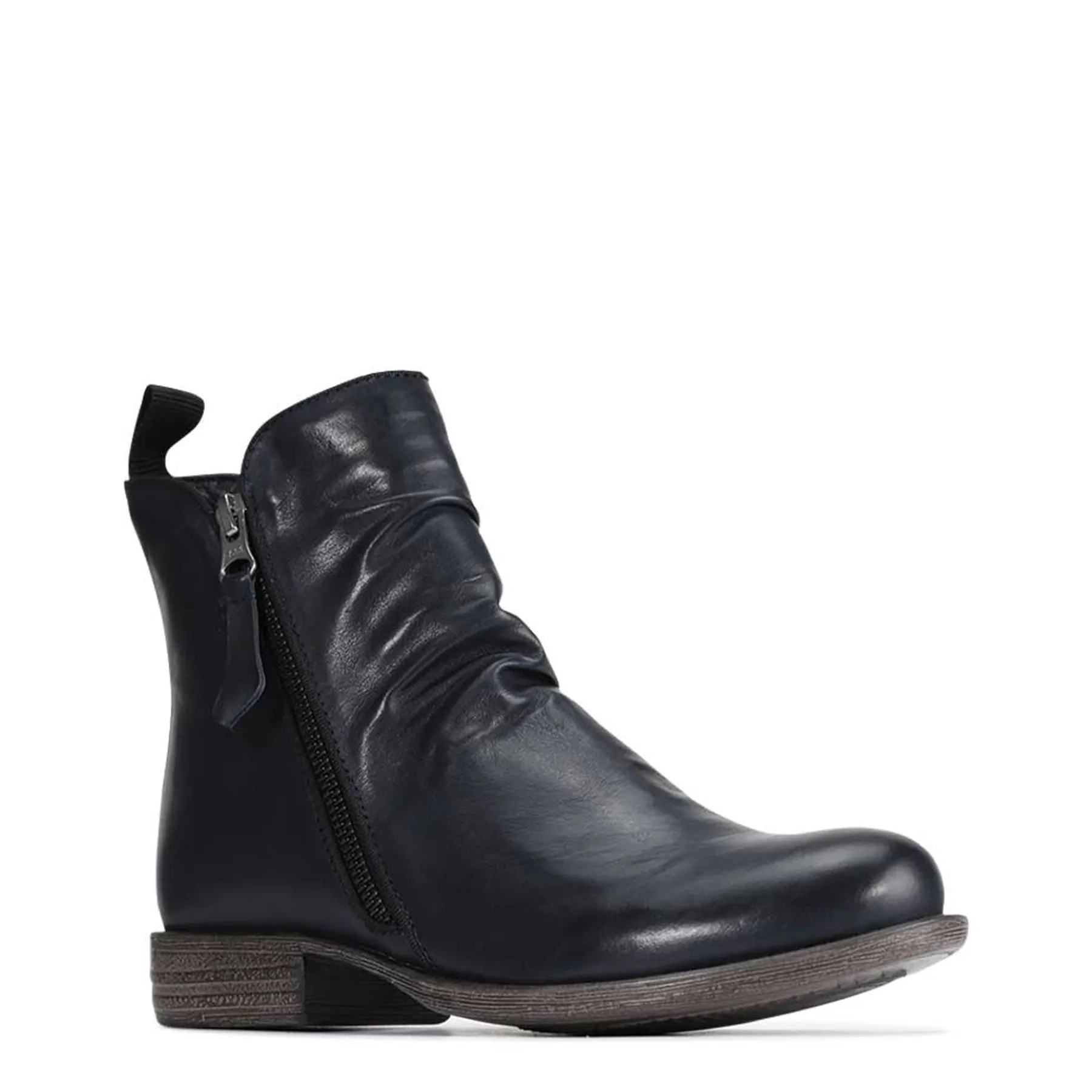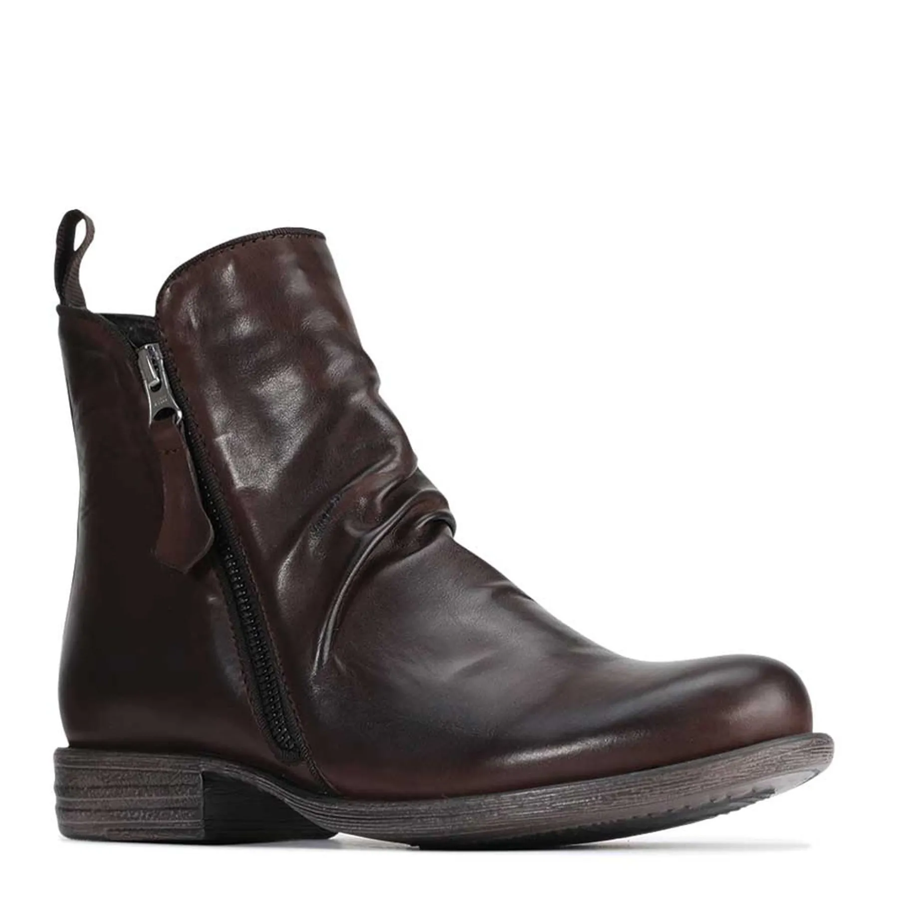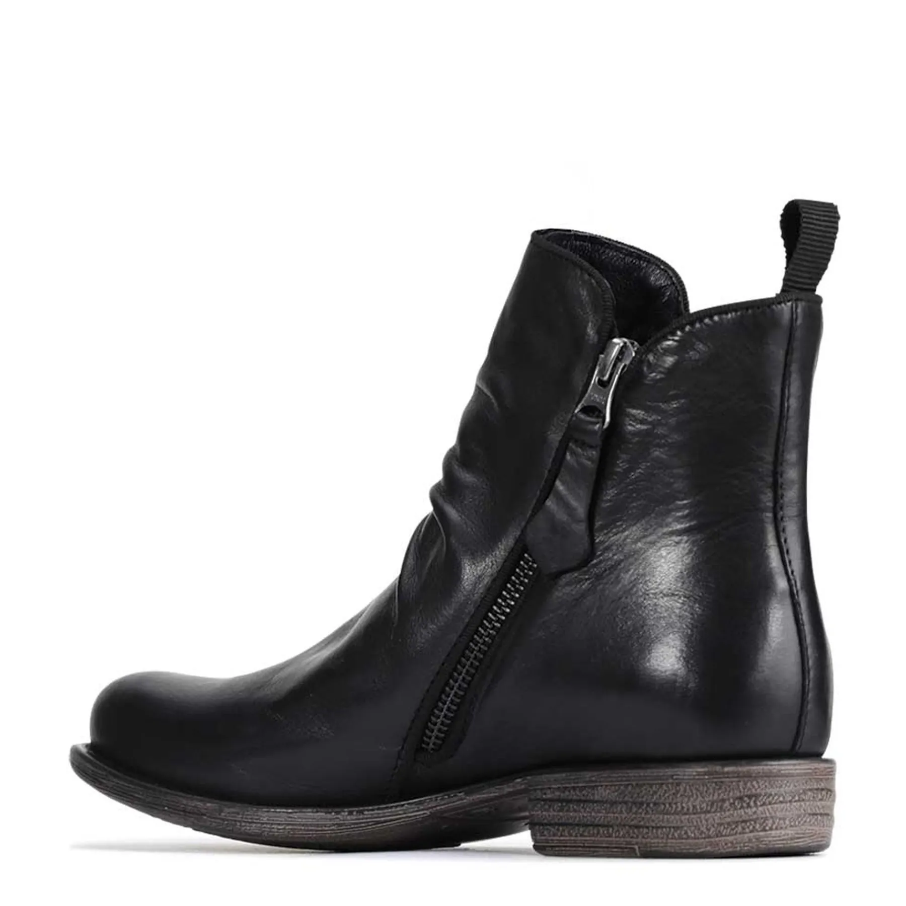 One for the wanderers at heart, these flat leather ankle boots are rugged, loveable rogues. They feature a signature slouchy draped front and slanted side zip. A long pull on the zip and loop tabs to the front and back makes slipping in and out of these beauties a breeze.