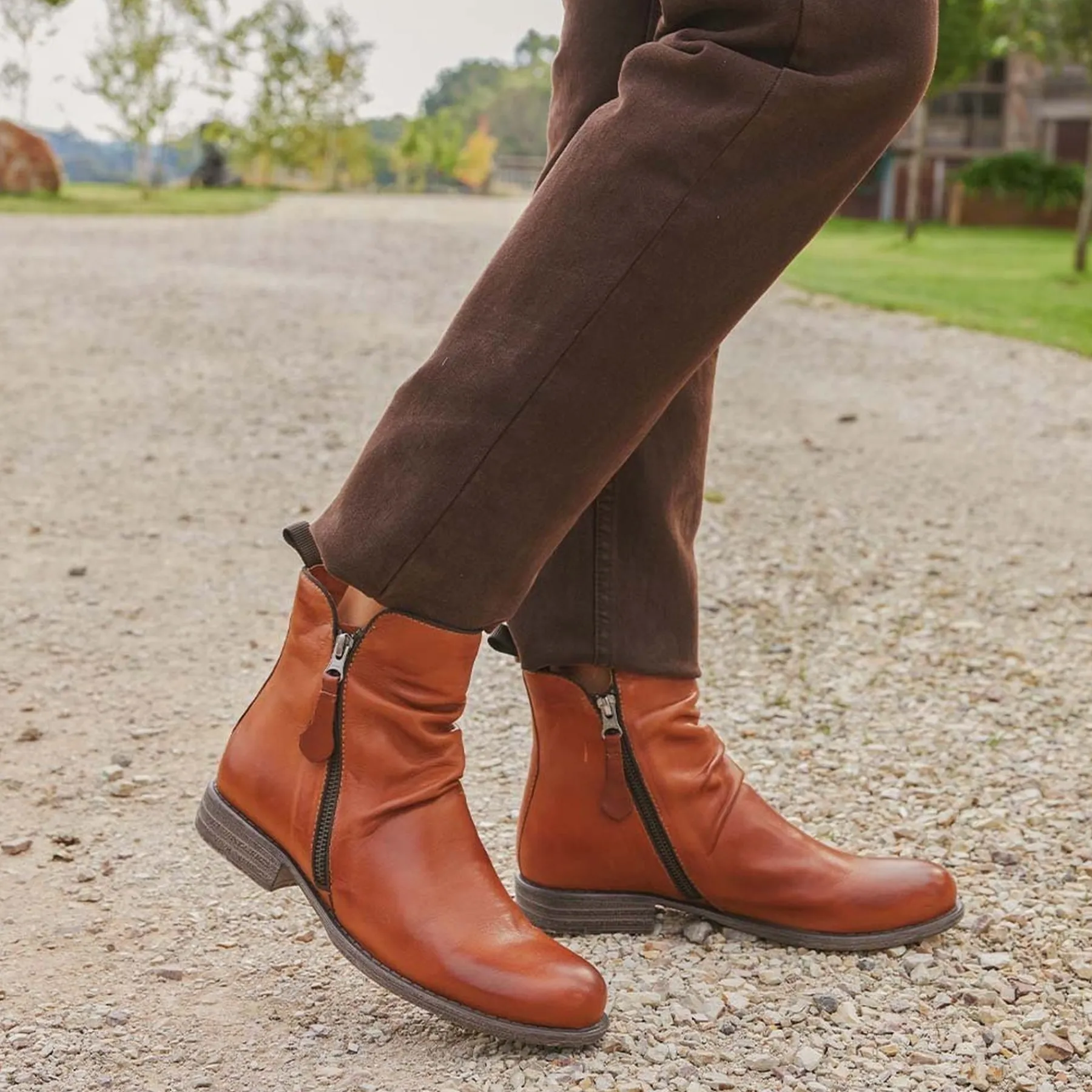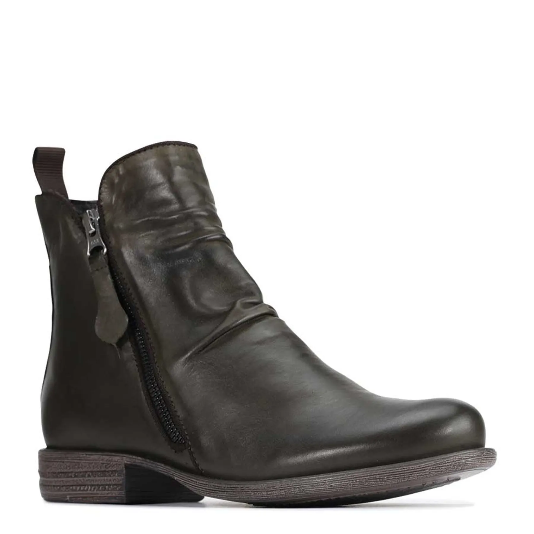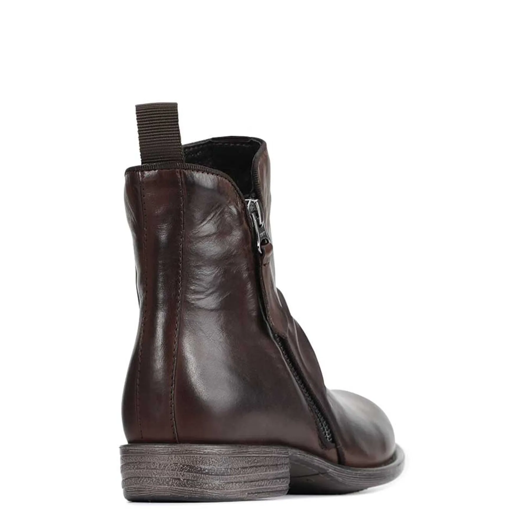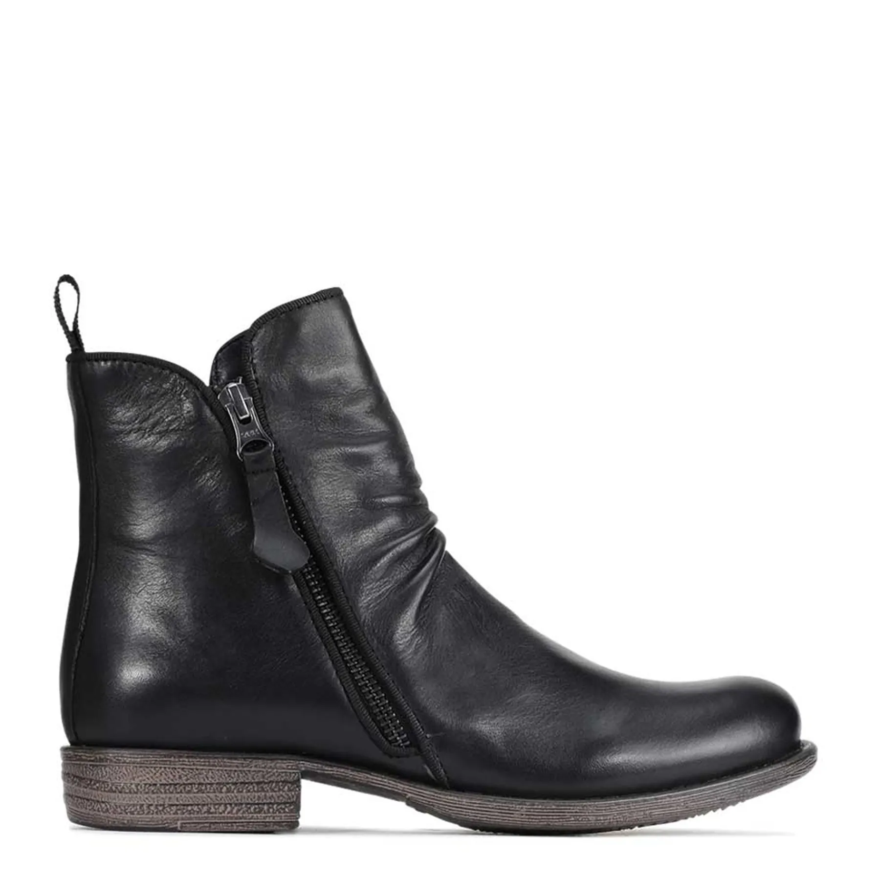 One for the wanderers at heart, these flat leather ankle boots are rugged, loveable rogues. They feature a signature slouchy draped front and slanted side zip. A long pull on the zip and loop tabs to the front and back makes slipping in and out of these beauties a breeze.
