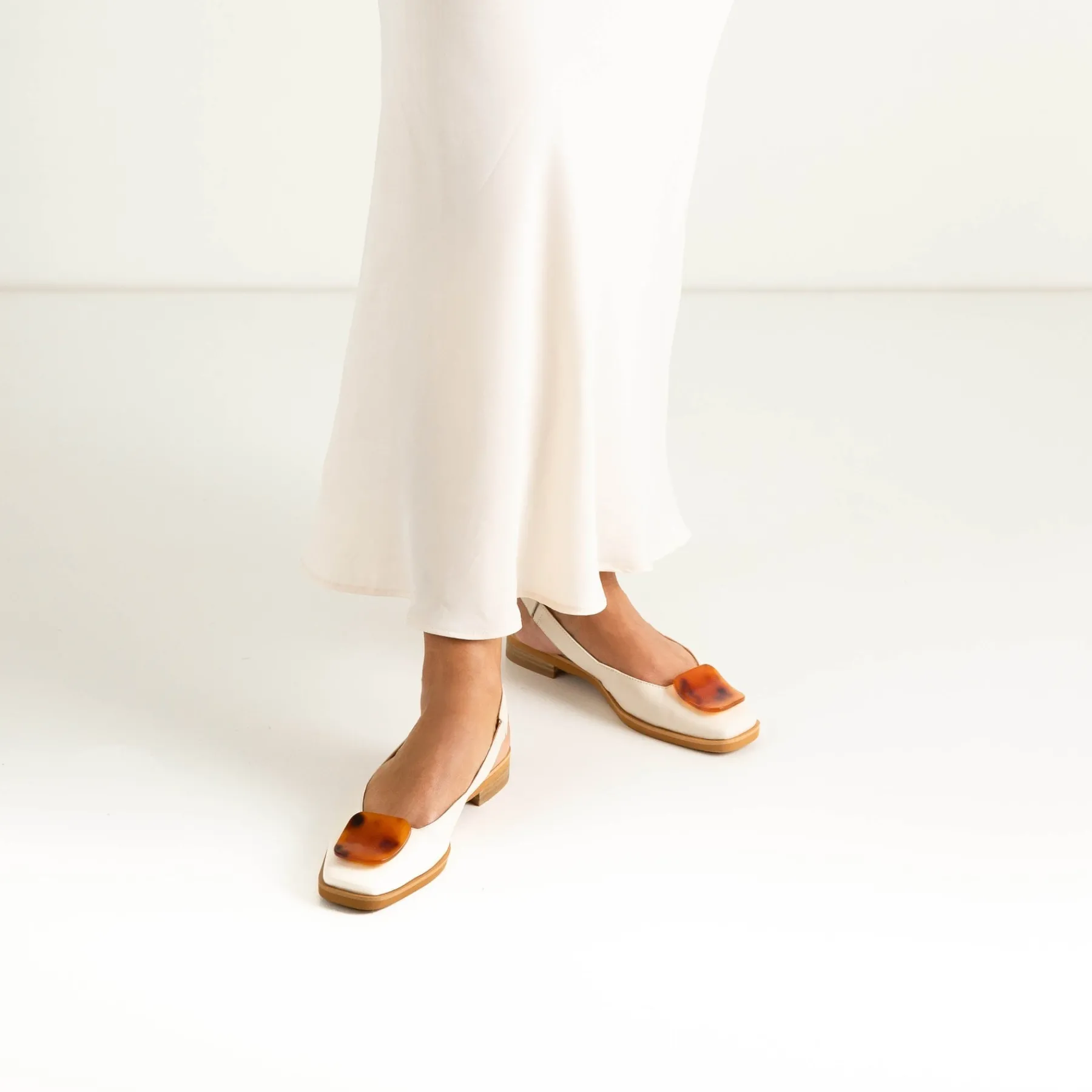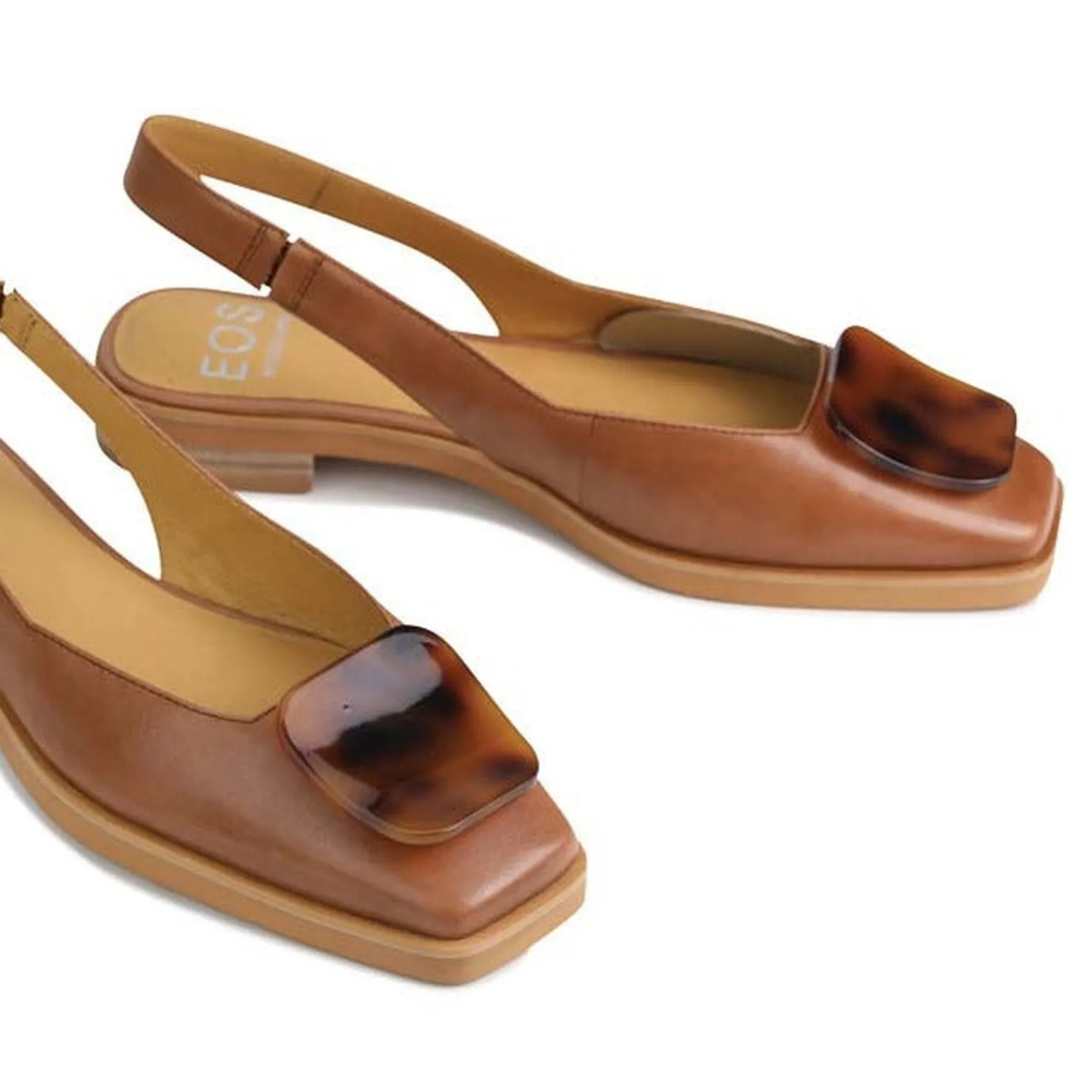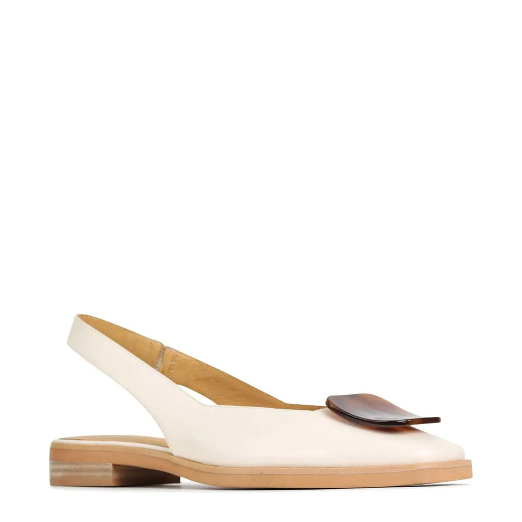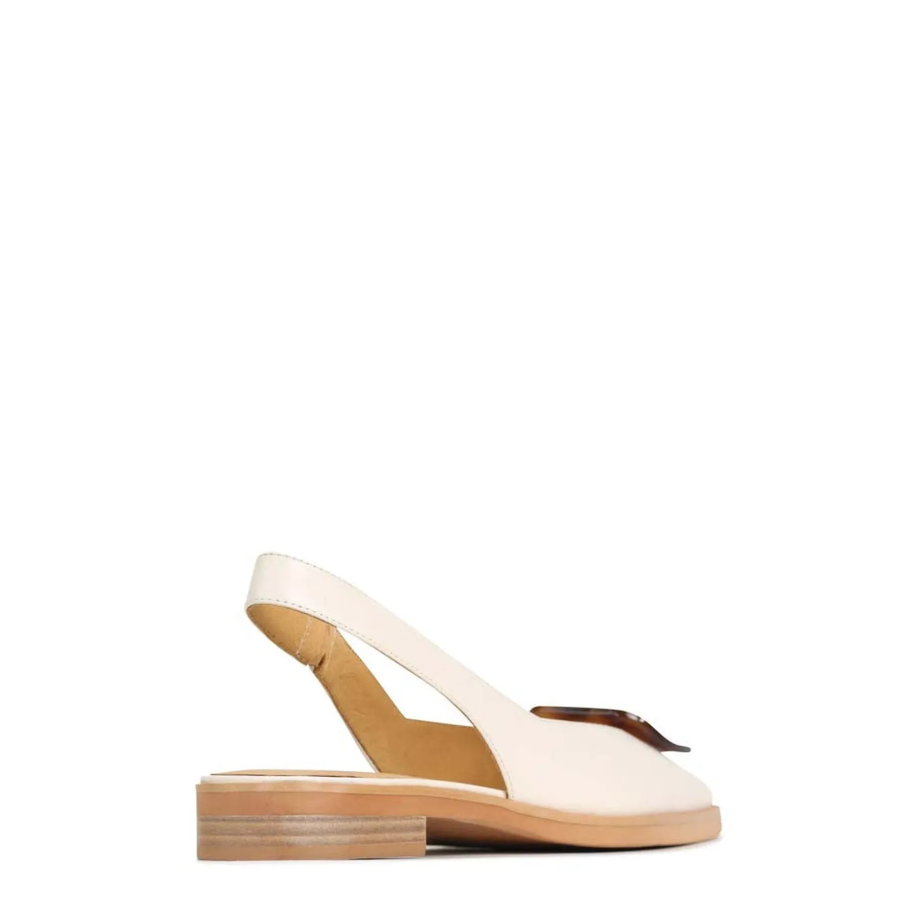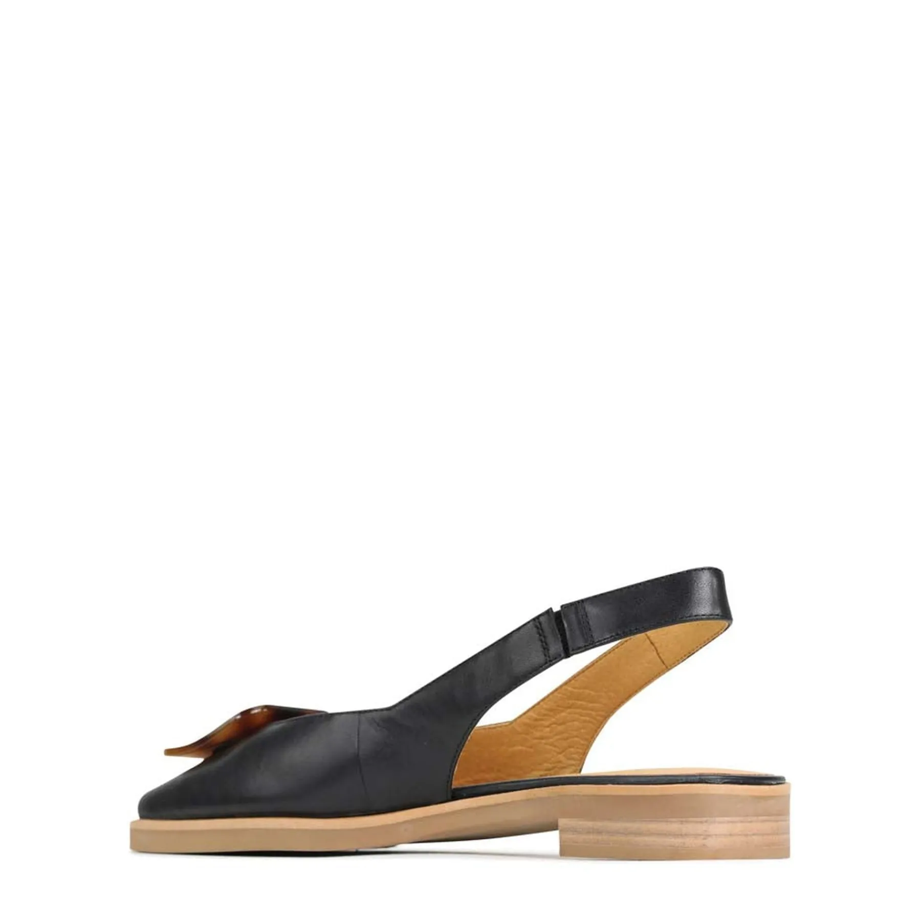 Experience the luxury of ESSY slingback flats: crafted with the finest leather, the low, leather stacked heel adds a touch of glamour to any look. Expertly finished with a tortoise shell ornament and square toe for a subtle hint of sophistication, ESSY flats will quickly become an everyday favourite.