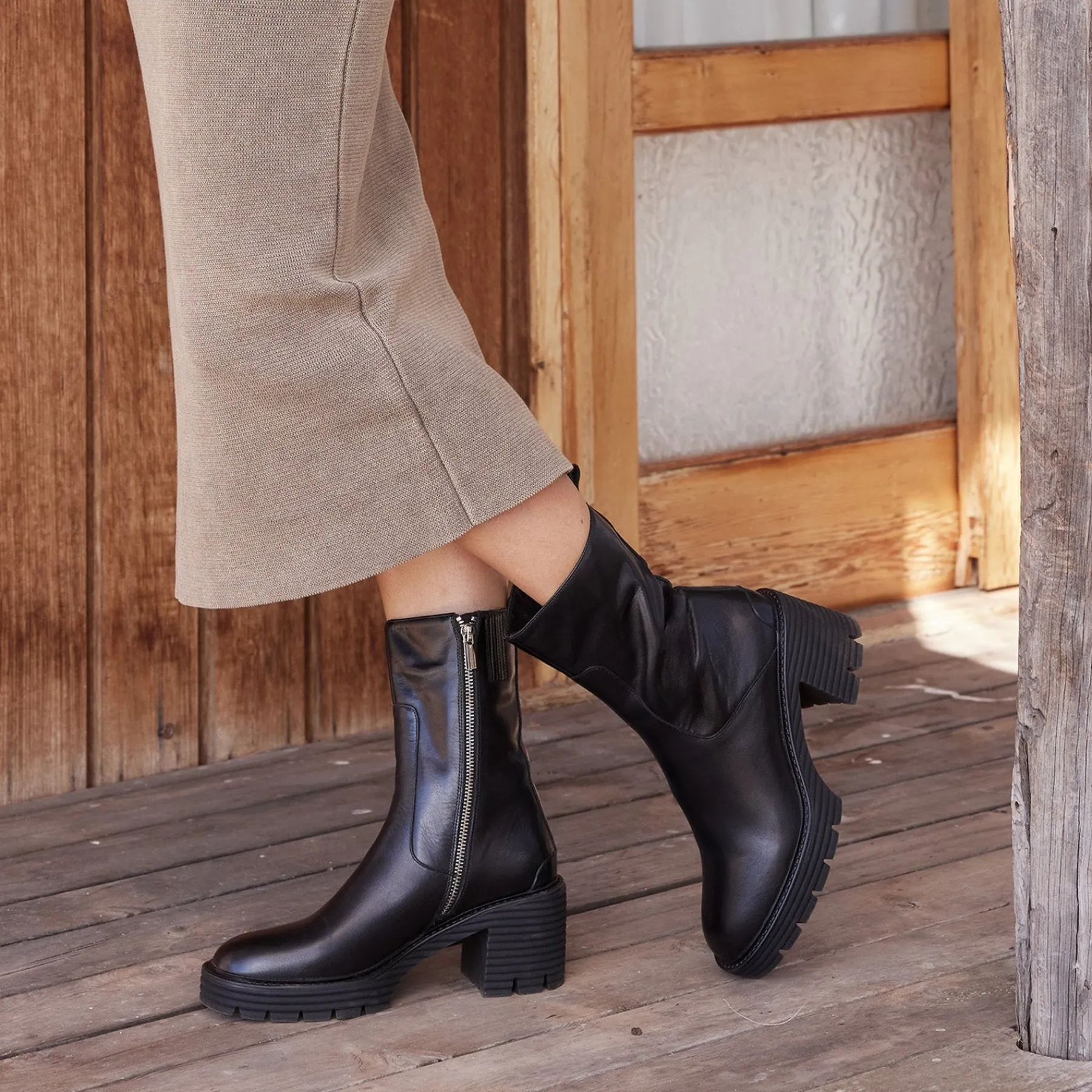 Discover the perfect blend of style and comfort with MALIKA mid boots. With a sturdy 70 mm block heel and a convenient inside zip, these leather boots offer both support and ease of wear. Plus, their super lightweight design means you can wear them all day without any discomfort.
