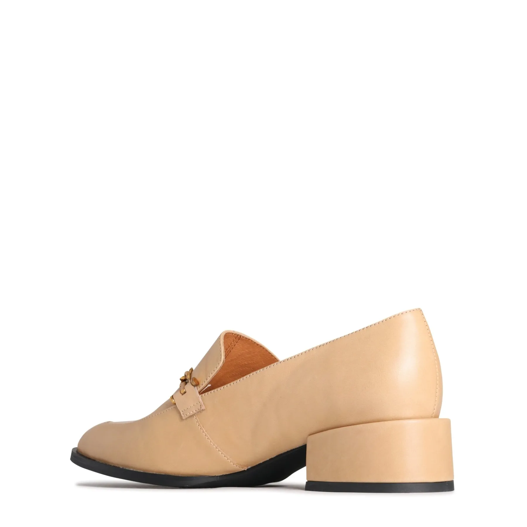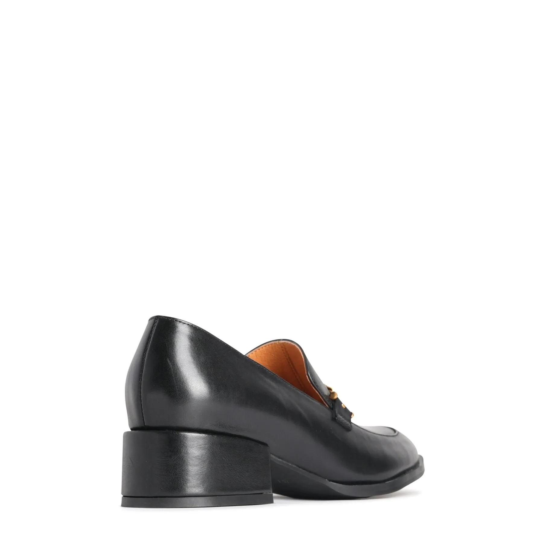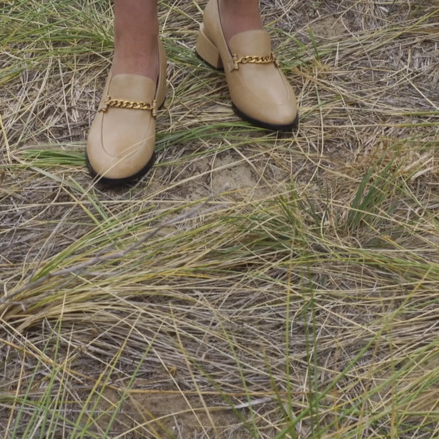Indulge in luxury with our CASTELLA heeled loafers. Crafted with a discerning eye for detail, each shoe features a classic design and a sleek block heel for effortless style. Adorned with a hand-finished metal chain, these loafers epitomise elegance and sophistication. Experience the superior quality and craftsmanship for yourself.